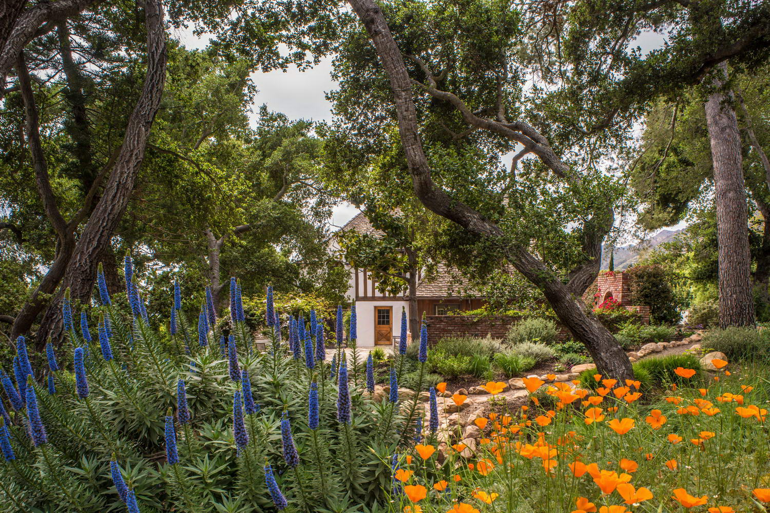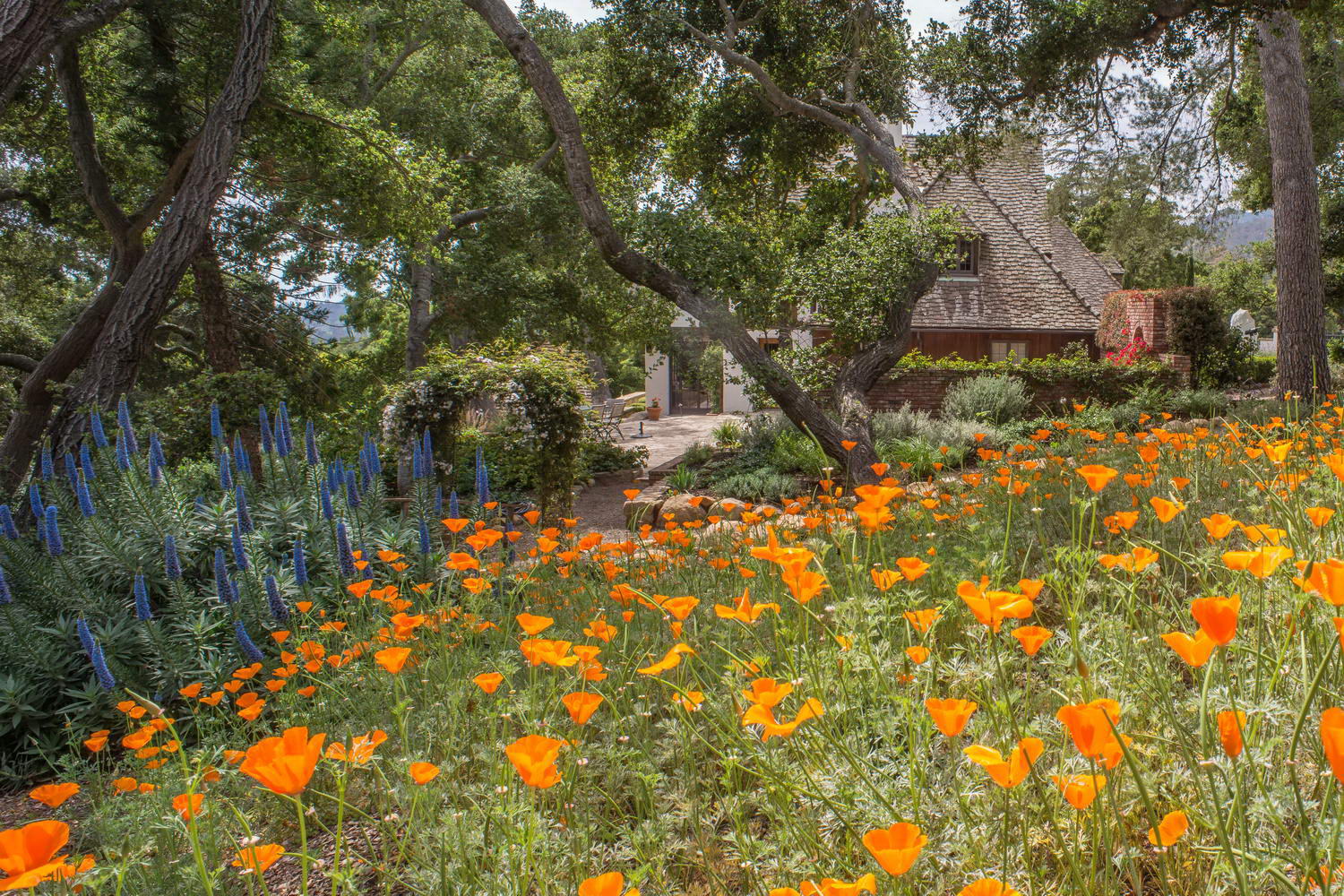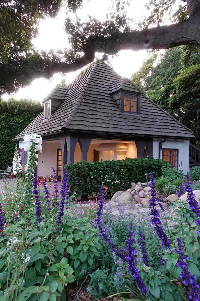 Lush and beautiful old oaks surround the residence. Natural stone pathways meander through a wonderland of color and landscaped grounds filled with fragrant roses, stone walls, a fruit orchard and vegetable garden (all fed by the onsite well). A playground and two-story studio and guest quarters complete this storybook setting.